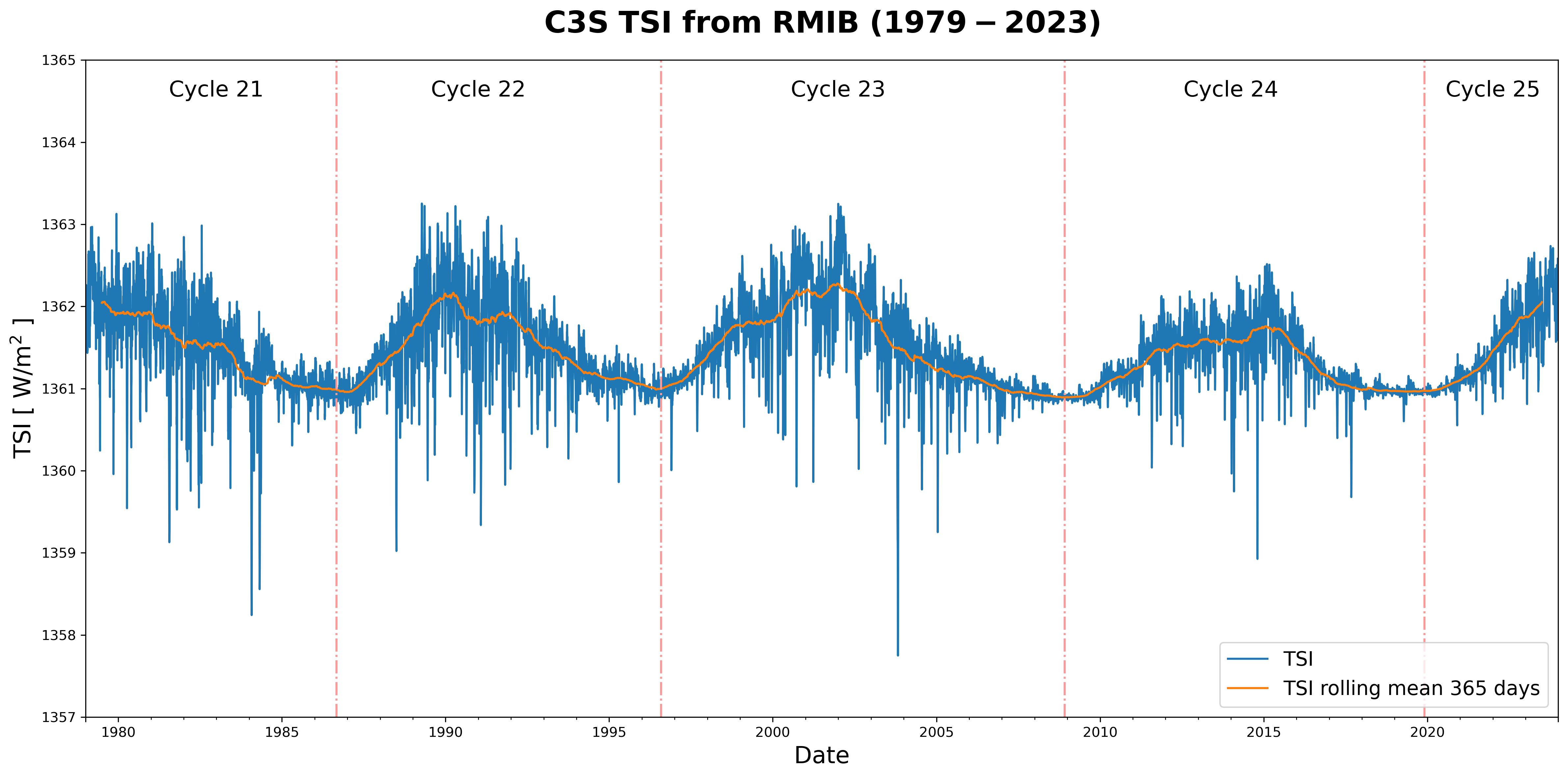 This notebook provides a practical introduction to the Total Solar Irradiance (TSI) dataset available at the Copernicus Climate Change Service (C3S) Climate Data Store (CDS)).
